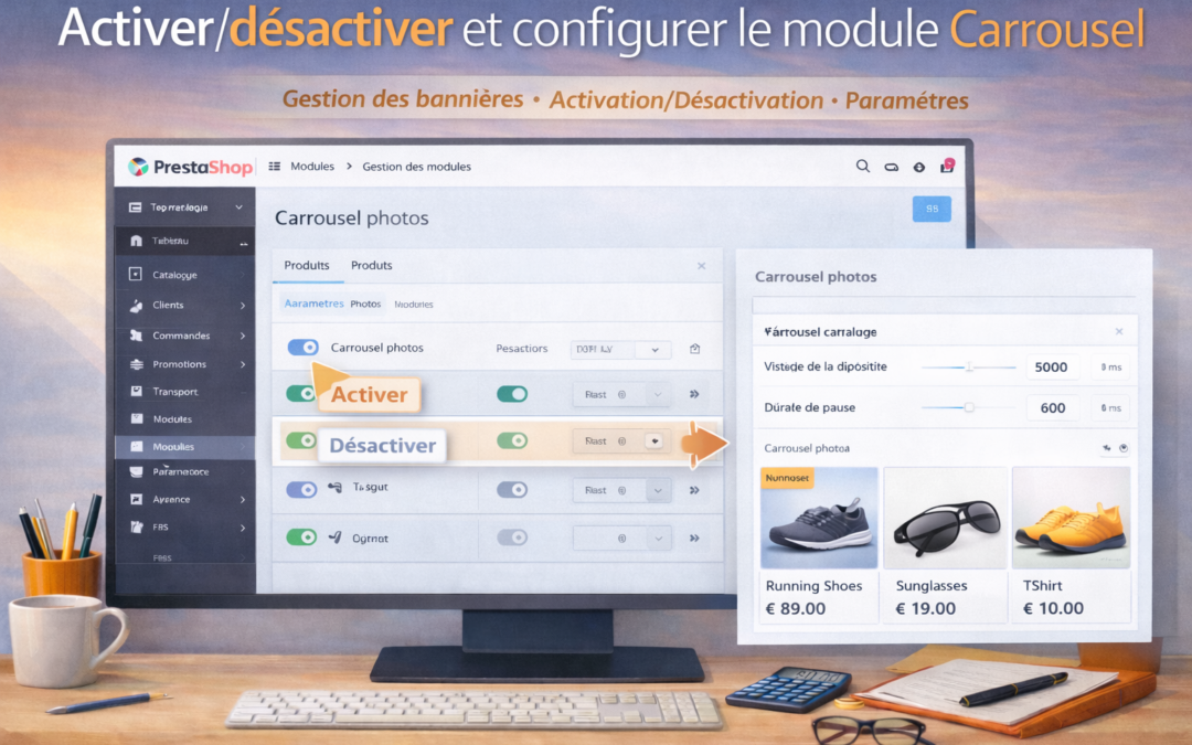 Le module Carrousel permet d’afficher un défilement de contenus (images, produits ou blocs) sur la page d’accueil de la boutique.