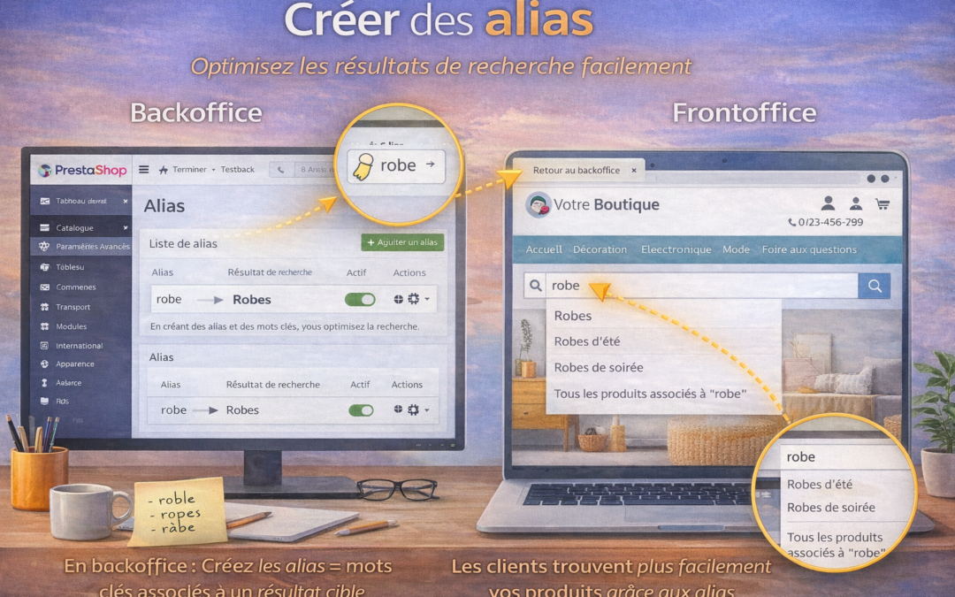 Les alias permettent de rediriger automatiquement une recherche ou une URL vers un autre mot ou une autre page de la boutique.