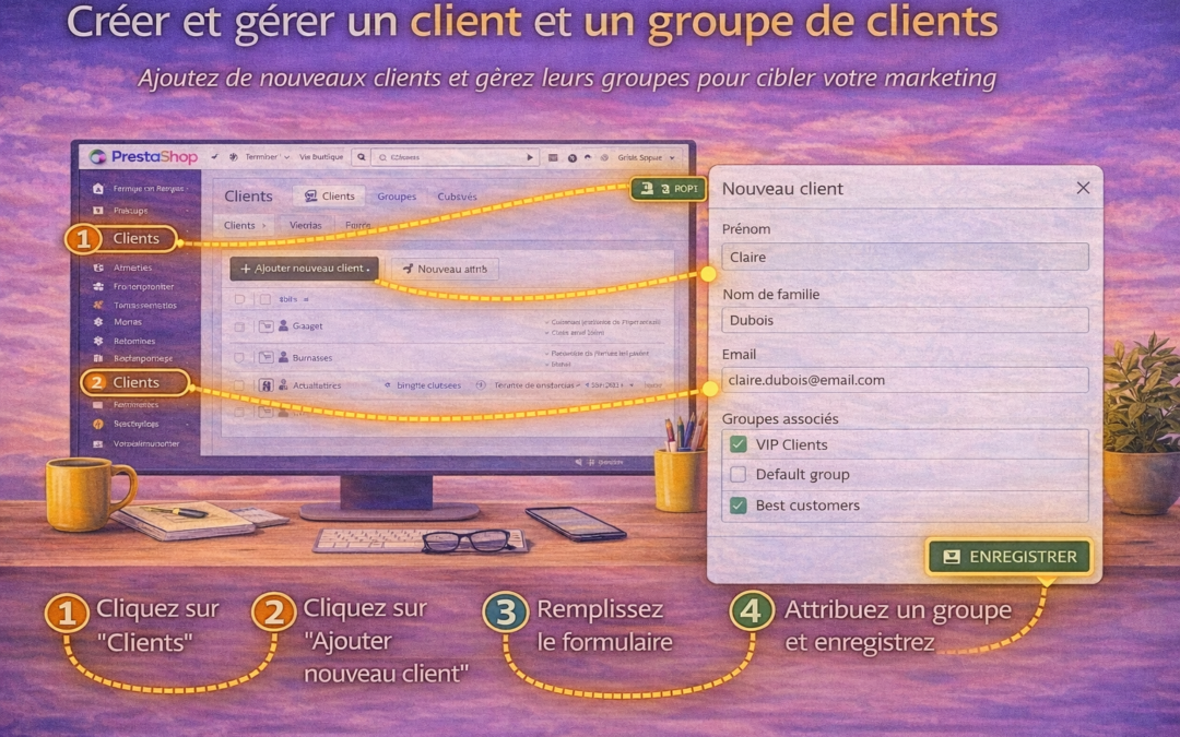 Les clients et les groupes de clients permettent de gérer les comptes utilisateurs de la boutique et d’appliquer des règles spécifiques (tarifs, accès, affichage).