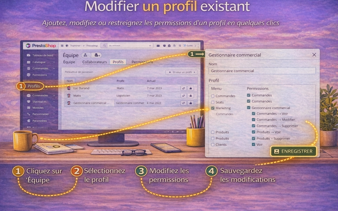 - Ajuster les permissions pour chaque section (Catalogue, Commandes, Clients, Modules…) :