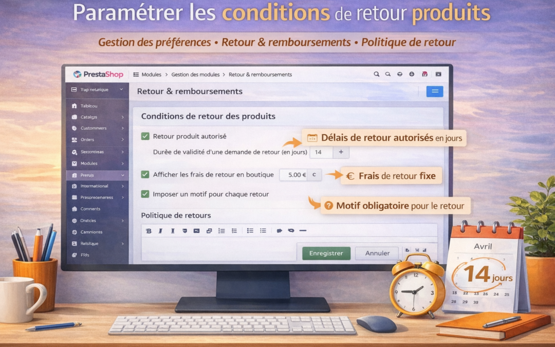 Les conditions de retour produits définissent les règles permettant aux clients de retourner un article après achat (délais, activation ou non des retours).