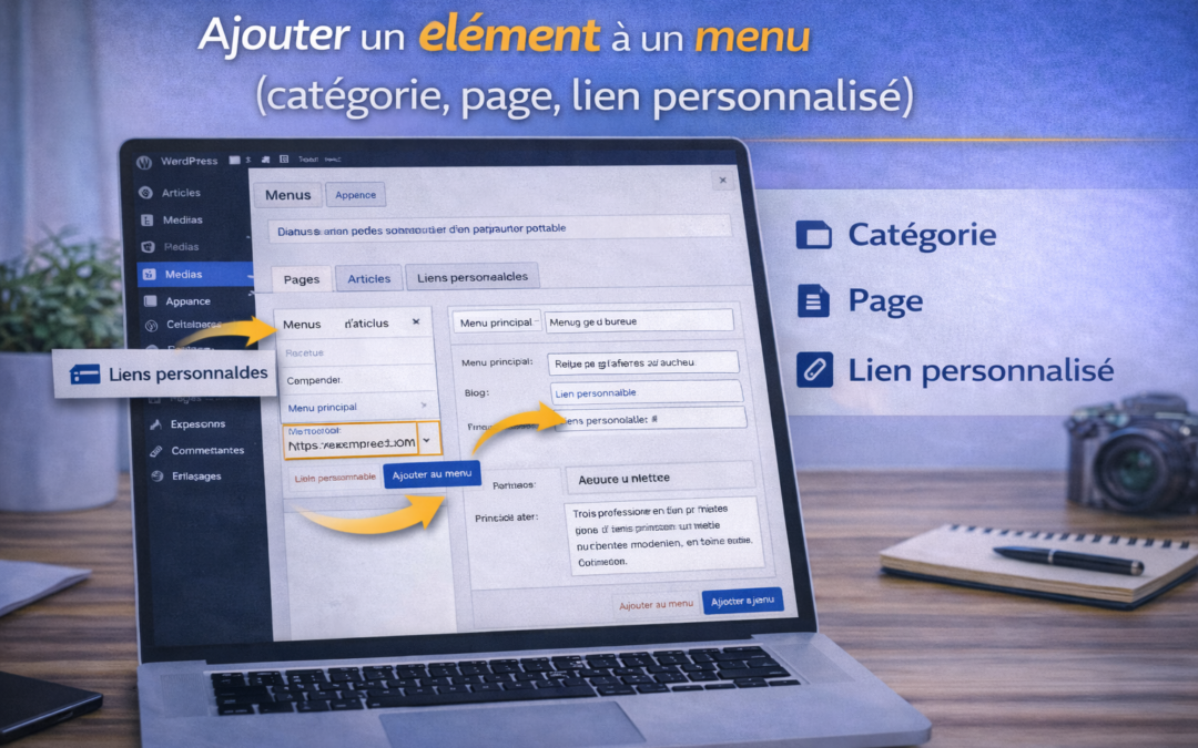 Les éléments de menu permettent d’accéder aux pages, catégories d’articles ou liens externes depuis la navigation du site.