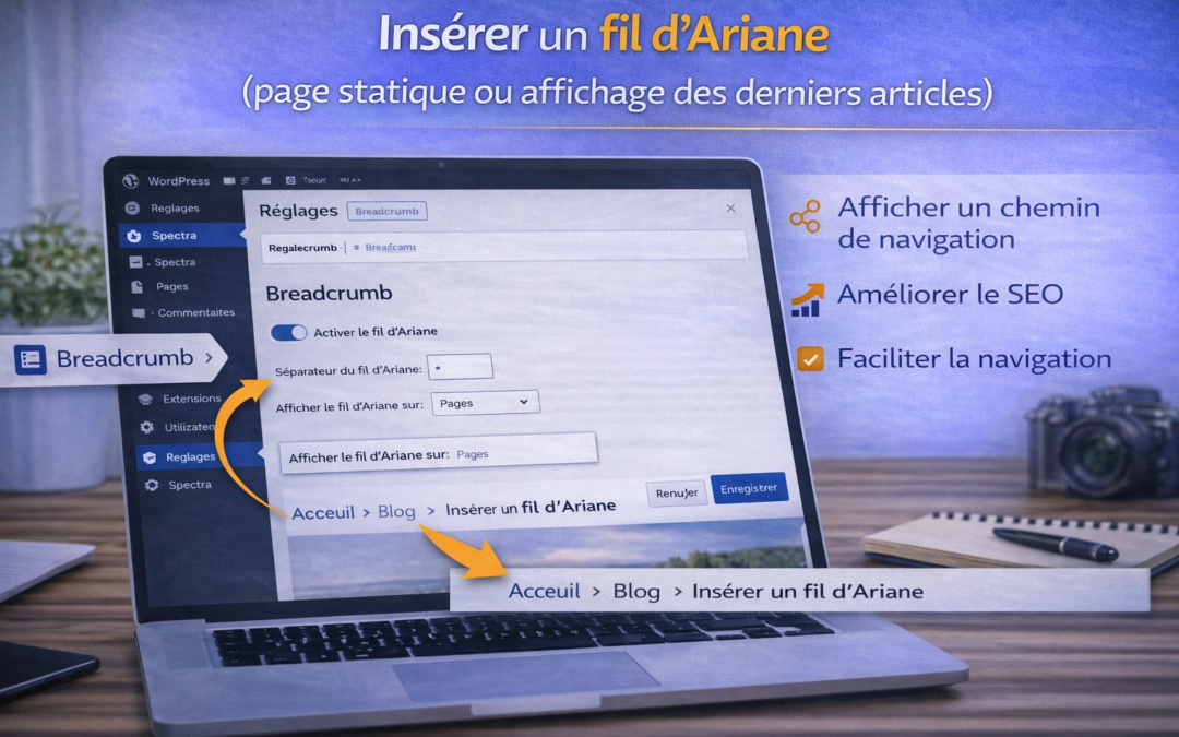 Le fil d’Ariane permet d’afficher le chemin de navigation de l’utilisateur sur le site (ex. Accueil > Blog > Article) afin de faciliter l’orientation et la navigation.